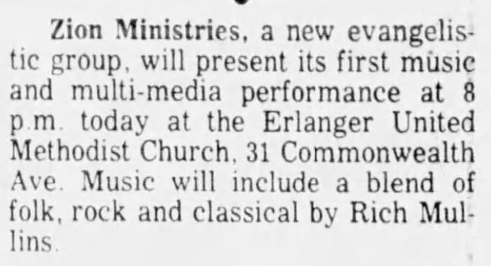 - Rich Mullins with Zion at Erlanger United Methodist Church in Erlanger, KY. at 8p.m. The event is billed as the "first performance" from Zion Ministries.